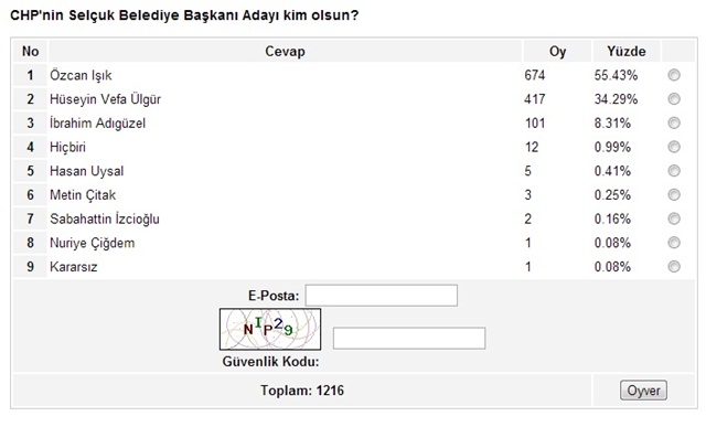 Bu anket nerede yapılmış ay damı sonuçlar çok komik ankara da tayip bitti ama selçuk ta vefa bitmez hasan uysalın oyunu özcana yazmasınlar dikkatle inceleyin özcanı kim tanır iskender denen kişi senin CHP li olmadığın belli ayrı tellerde oynama o partinin adını dahi zikretmek şurada dursun kayle bile almam burada seçim CHP ve MHP arasında geçecek çok çalışan kazanır CHP de aday çenenizi boşuna yormayın HÜSEYİN VEFA ÜLGÜR