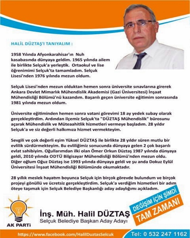4 yıldır yönetim kurulu üyeliği ve Teşkilattan Sorumlu Başkan Yardımcılığı görevlerini başarılı bir şekilde yürüttüğüm AK PARTi’den Selçuk Belediye Başkanlığı Aday Adaylığı’na, bu onurlu göreve, “Değişim İçin, Şimdi Tam Zamanı” sloganı ile talip oldum.