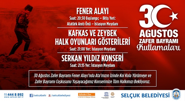 Selçuk Belediyesi tarafından 30 Ağustos Zafer Bayramı’nda düzenlenecek Fener Alayı 20.30’da Atatürk Anıtı Önü’nden başlayıp İstasyon Meydanı’nda son bulacak. Fener Alayı’nın ardından İstasyon Meydanı’nda saat 21.00 de Kafkas ve Zeybek halk oyunları gösterisi Selçuklularla buluşacak. 30 Ağustos Zafer Bayramı coşkusu saat 21. 15’de İstasyon Meydanı’nda düzenlenecek olan Serkan Yıldız Konseri ile devam edecek.