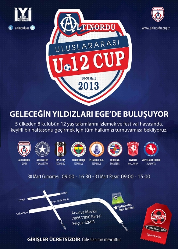 Özkaynak Projesi’ni hayata geçirmek amacıyla tarihindeki ilk uluslararası organizasyonu düzenlemenin heyecanını yaşayan Altınordu, ev sahipliği yapacağı şenlik için tüm hazırlıklarını tamamladı. Cumartesi ve Pazar günü 5 ülkeden 8 takımın katılımıyla Selçuk-Efes Tesisleri’nde organize edilecek Uluslararası U-12 Cup’ta başta Altınordu olmak üzere Fenerbahçe, Beşiktaş ve İstanbul Büyükşehir Belediyespor’un yanı sıra İngiltere’den Reading, Hollanda’dan Twente, Almanya’dan Herne ve Yunanistan’dan Atromitos takımları katılacak.