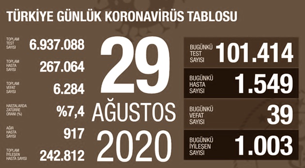 Bugünkü iyileşen hasta sayısı 1003 olurken toplam iyileşen hasta sayısı 242 bin 812’ye ulaştı. Hastalarda zatürre oranı yüzde 7,4 olurken ağır hasata sayısı 917 olarak kayıtlara geçti. Sağlık Bakanı Fahrettin Koca, Twitter hesabından yaptığı değerlendirmede, “Toplamda 7 milyona yakın test yaptık. Bugün aktif hasta sayımıza 546 kişi daha eklendi. Kaybettiğimiz hasta sayımız toplamda 6.000’den fazla. Ağır hasta sayımızda artış devam ediyor. Tedbirlere uymada gevşek olamayız. Güç tedbirde” ifadelerini kullandı.